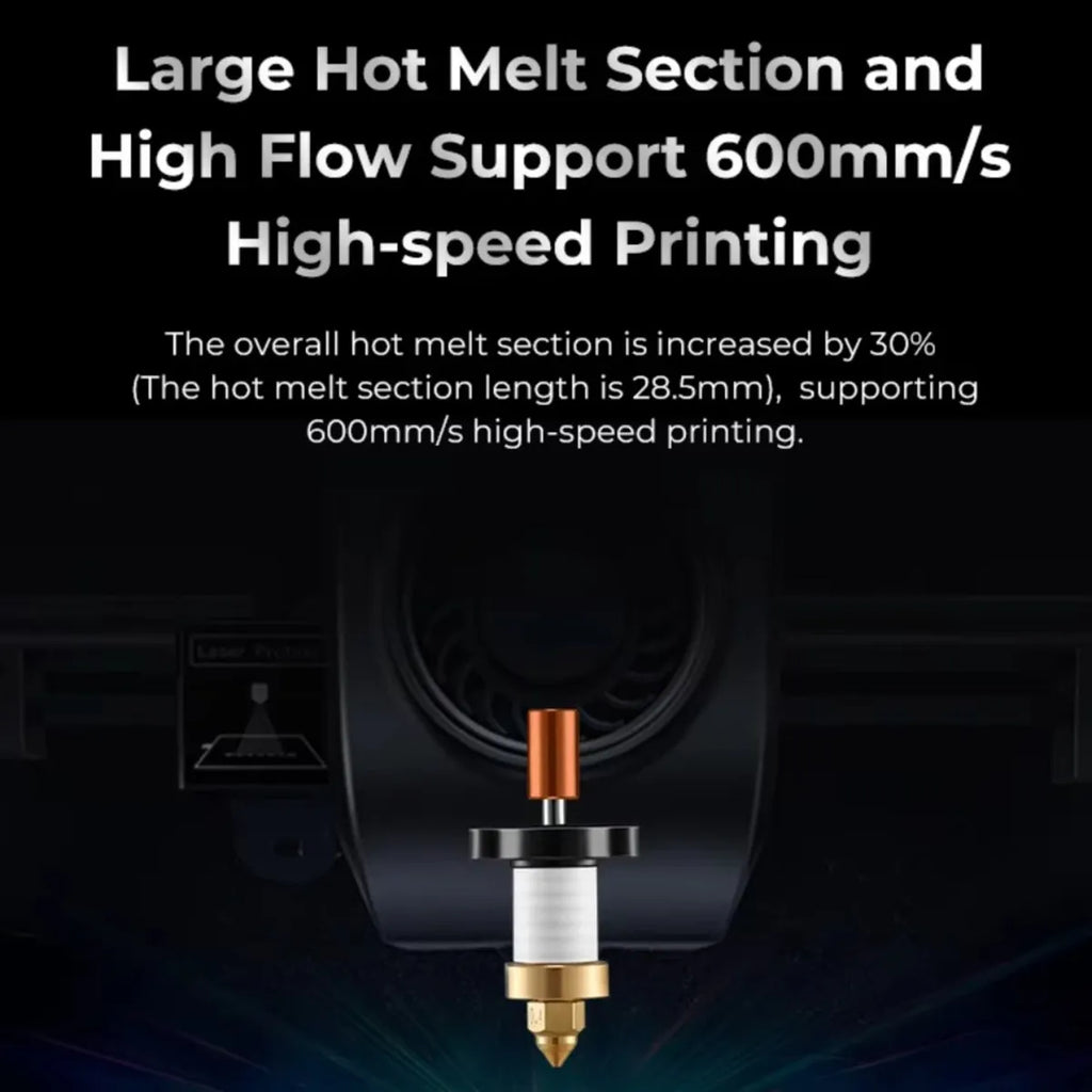 O diferencial chave do Hotend é sua construção em cerâmica de alta condutividade térmica. Isso garante uma dissipação de calor eficaz e proporciona uma resistência excepcional a temperaturas elevadas de até 320 °C. Com essa capacidade, você poderá enfrentar projetos mais desafiadores e imprimir a altas velocidades de até 600 mm/s, sem sacrificar a qualidade.